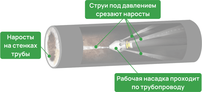 Гидродинамическая прочистка канализации основана на использовании высокого давления воды для удаления загрязнений и пробок в канализационных системах. Принцип работы метода заключается в том, что струя воды под давлением проникает в трубопроводы и эффективно разрушает и смывает все накопившиеся отложения и препятствия.